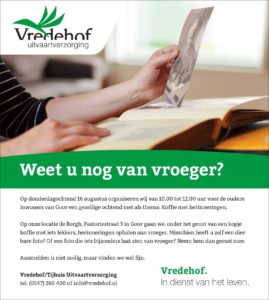 Op donderdagochtend 16 augustus organiseert Vredehof/Tijhuis Uitvaartverzorging van 10.00 tot 12.00 uur in uitvaartcentrum De Borgh, Pastoriestraat 3 in Goor, een gezellige ochtend voor de oudere inwoners van Goor. Het thema van deze ochtend is “koffie met herinneringen”. De bezoekers mogen zelf dierbare of bijzondere foto’s meenemen waarna er gezamenlijk herinneringen worden opgehaald. En uiteraard zijn er ook foto’s aanwezig uit het nabije en verre verleden van Goor. Misschien weet u nog hoe het vroeger was?